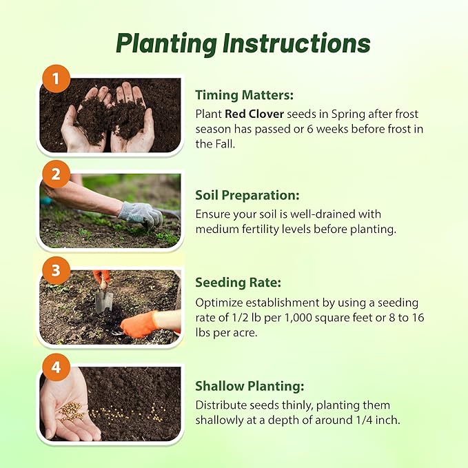 - EASY PLANTING & SEASONAL GUIDELINES: Plant these red clover seeds at 1/2 lb per 1,000 sq ft or 8-16 lbs per acre, with a seeding depth of 1/4 inch. In the north and central regions, plant in late winter to early spring; in the south, plant in autumn for optimal growth and maximum crop potential. The seeds are coated with inoculant for better establishment and yield potential, ensuring robust growth and high germination rates.
