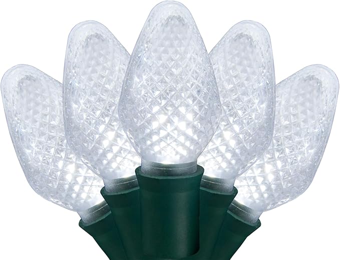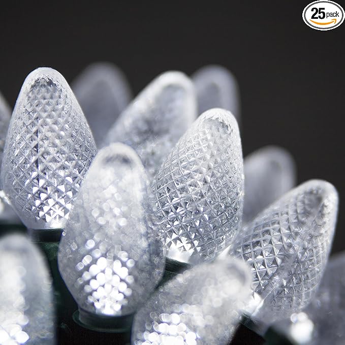 - [ 25 C7 COOL WHITE NON-TWINKLE LED LIGHTS ] Set of 25 cool white C7 steady LED lights spaced 8 inches apart on green wire, 6-inch lead with fused stackable male plug, 17 feet total length. Please check bulb size before ordering (see "C7 Set Dimensions" graphic). C9 bulbs are larger than C7. Overall height of 3" vs 2.1".