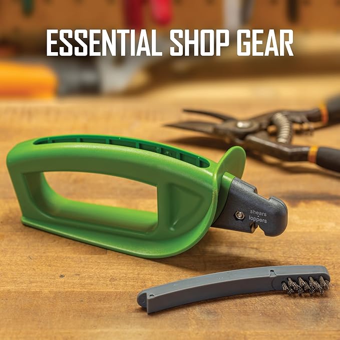- LARGE HANDLE – This durable sharpener has an oversized soft-grip handle, so it is easy to use with gloves & has a large finger guard for safe and secure sharpening. It also features a wire-bristled cleaning brush that conveniently stores in the handle.