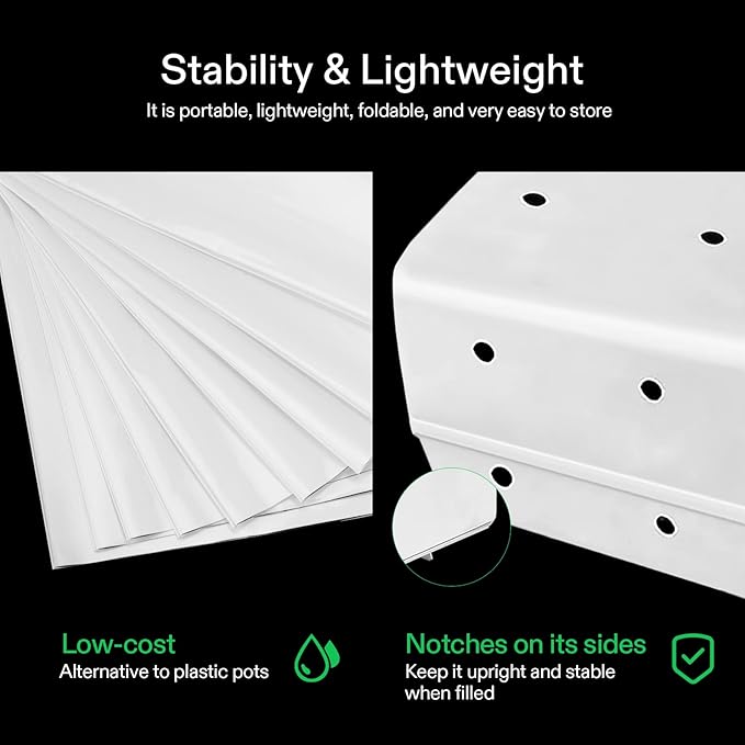 - Stability & Lightweight: The VIVOSUN Plastic Bag has notches on its sides to keep it upright and stable when filled and only weighs 1.2 pounds, so it is portable, lightweight, foldable, and easy to store; The dimensions are 7” x 5.7” x 14”(folded size)