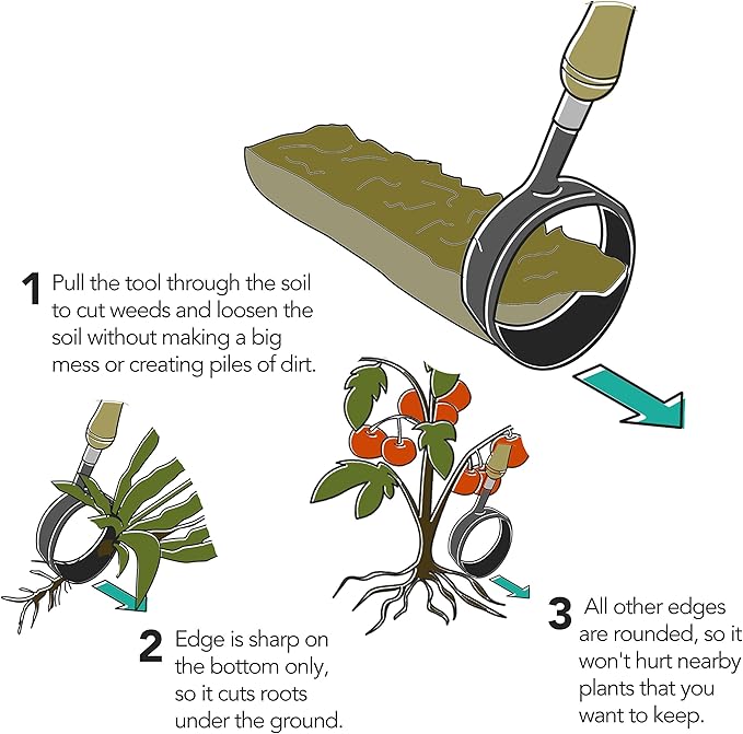- Drag at ground level to cut weeds at the roots. Bottom is sharp and sides are dull, so you can use it near important plants and only cut weeds. See graphic in the photos for more information.