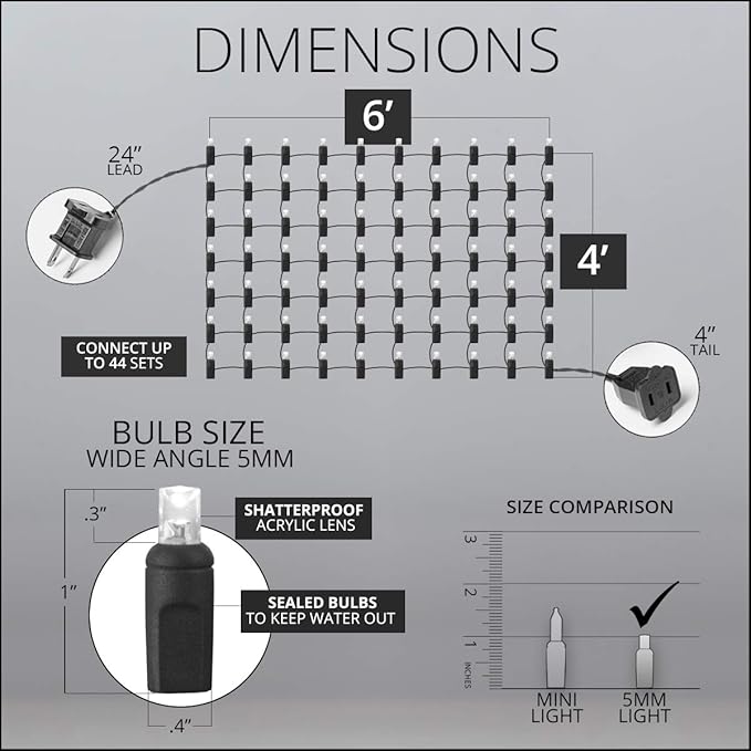 - Less than 5 watts per light set; safely connect up to 44 nets end to end; if one light goes out the rest stay lit