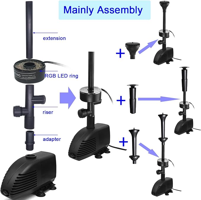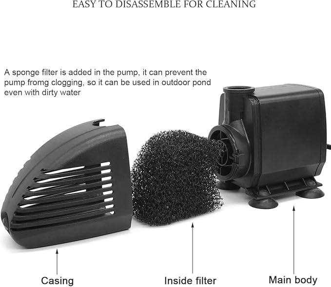 - 4 water patterns: Blossom, Frothy,Mushroom and Two-Tier Style. Inside filter design, prevents clogging in outdoor pond.