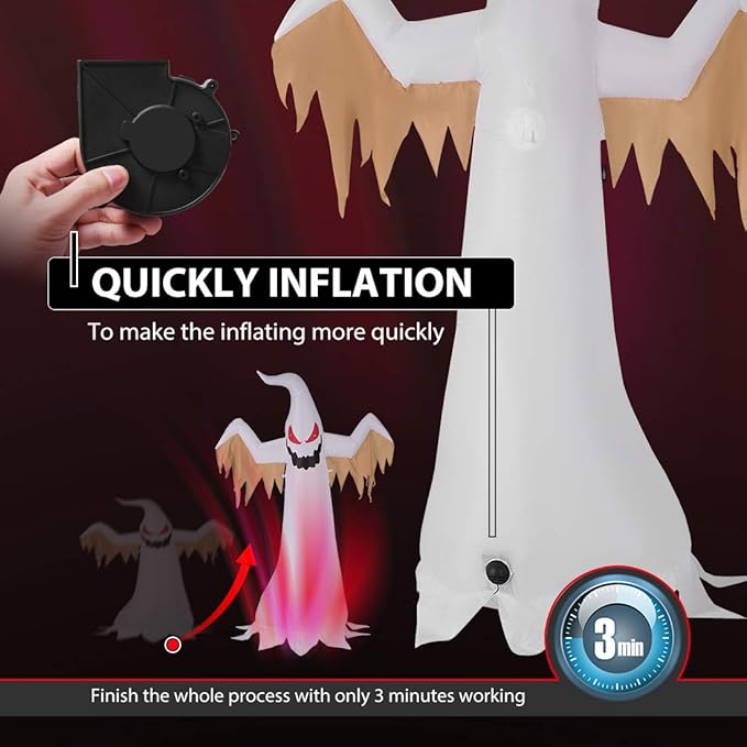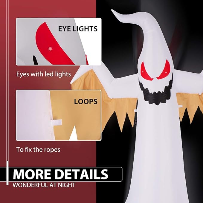 - HOLIDAY ACCENT - The scarlet ghost with creepy red eyes are swaying and stretching its claws in the breeze, giving you a different Halloween experience in the Trick or Treats and other activities; Creating a fun, memorable scene in your house or on your lawn during the holiday season; Plus there are tethers on both sides of the product, keeping it secure to the ground