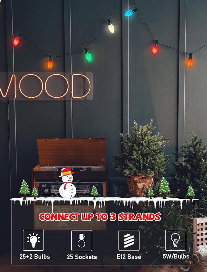- Multicolor C7 Christmas Lights: 25 feet Christmas lights with 27 C7 ceramic multicolor light bulbs(Red, Blue, Green, White and Orange Bulbs), end to end connectable. Christmas string light bulbs have C7 candelabra (E12) socket base, UL listed. The cord is flexible and thicker than a traditional cord so that you can confidently leave these durable decoration string lights on the tree, tent and many other occasions or events, Christmas, party, etc
