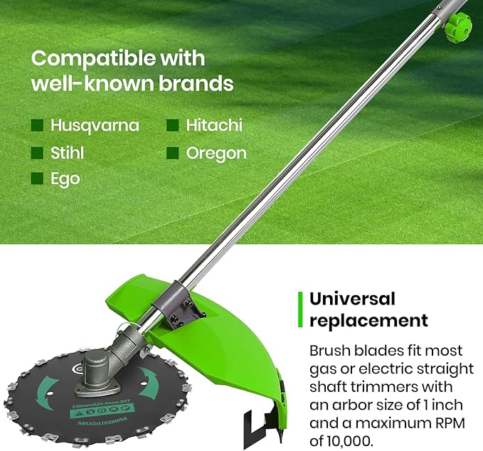 - Universal Brush Cutter Blades: These 9" Brush Cutter Blades with 1" arbor are compatible with gas or electric straight shaft trimmers from Husqvarna, Stihl, Ego, Oregon, and Hitachi. Perfect for trimming trees, underbrush, and more.(Max speeds of 10,000 RPM)