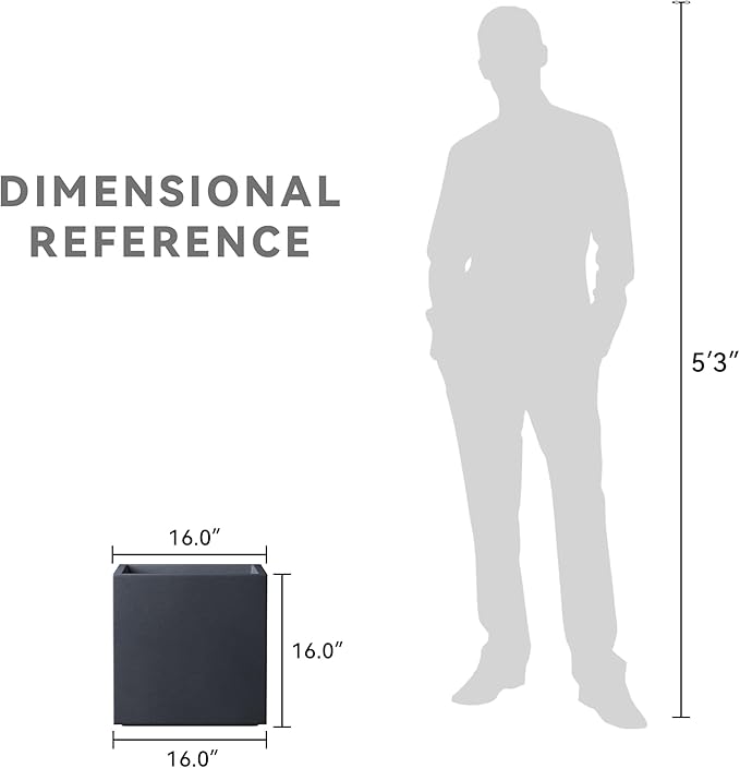 Kante 16 Inch Square Concrete Planter for Outdoor Indoor Home Patio Garden, Large Plant Pot with Drainage Hole and Rubber Plug, Charcoal