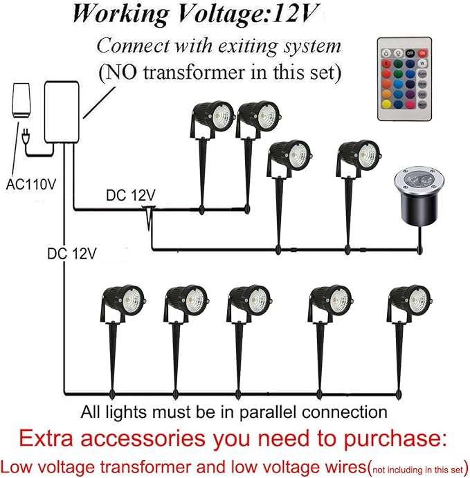 - 【Need additional accessories】Low voltage transformer and low voltage wires( Buyers buy by themselves)( NOT INCLUDED in this pack)