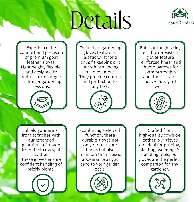 - Thorn Resistant Leather Garden Gloves - Crafted with A-grade goatskin leather for exceptional puncture resistance, these long gloves keep your hands secure from rose thorns, rough rocks, and prickly plants. Ideal for rose pruning and yard work.