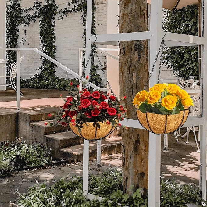 - Natural & Durable Material: For our metal hanging flower basket with pot liners for plants, the coco liners for planters are made of 100% natural coconut fibers which has good air permeability and water retention; the frame and hanging basket chain are made of iron with powder-coated to prevent rust, which is strong and durable. So you can rest assured to use them outdoors