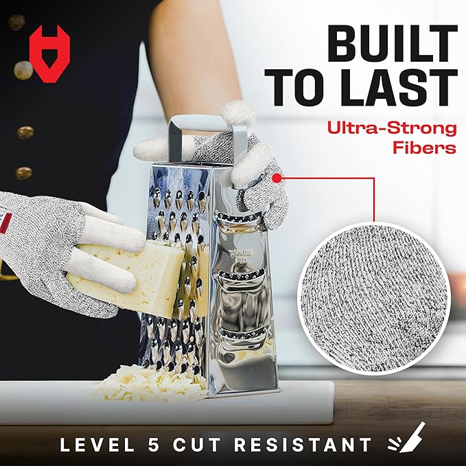 - FOOD SAFE SO YOU CAN USE THEM IN THE KITCHEN AND BEYOND. Protect your hands in the kitchen and slip these cut resistant gloves on before slicing meat, chopping vegetables, cooking, using a cheese grater, cleaning fish, carving a fillet, or shucking oysters. And they also double up as great protection for wood carving, whittling, woodworking and fishing.