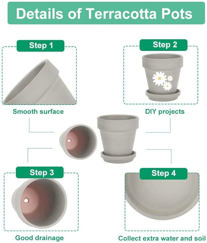 - 【Premium Quality】The grey clay pot made of top-quality clay and baked at 1796°F high temperature, each Terracotta Pots with grey paint features great durability. All packages have passed the 3-foot drop test to ensure the pots stay intact during delivery.