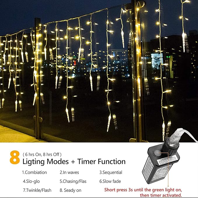 - 【8 Modes with Memory Function】This Christmas icicle lights have 8 different modes:Combination, In waves, Sequential, Slogs, Chasing/Flash, Slow fade, Twinkle/Flash and Steady on. The Christmas fairy lights have a memory function, which could recover from the previous setting mode when you restart.Different modes represent different moods and no need to reset mode every day(Note:The memory function is only work in the event of power, if plug out, the memory will disappear)
