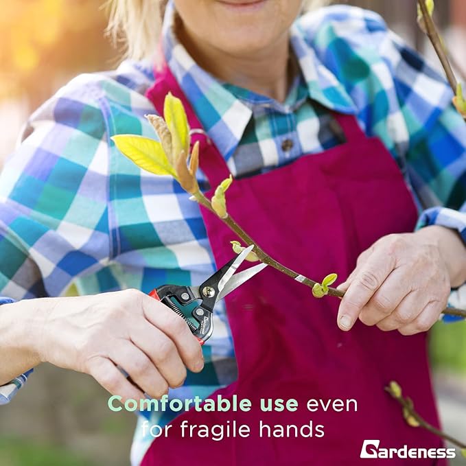 - 【PRECISION CRAFTSMANSHIP】: Experience the artistry behind Gardeness gardening shears, featuring fine SK5 steel blades celebrated for their exceptional sharpness and precision. These blades shine when cutting tougher, slender branches (6mm or less) and flower stems. Remember, applying oil after each use is crucial to prevent oxidation and rust.