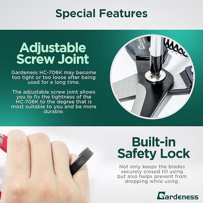 - 【PRACTICAL AND EFFORTLESS DESIGN】: Gardeness garden pruning shears are meticulously crafted for practicality and user-friendliness. The lower serrated blade securely grips stems, allowing effortless, clean cuts. The ergonomic handle guarantees comfortable use, turning harvesting into a breeze. Over time, blade stickiness due to tree sap can hinder proper opening and closing, but adjusting blade tension is a breeze with a simple screwdriver.