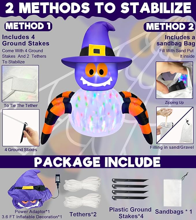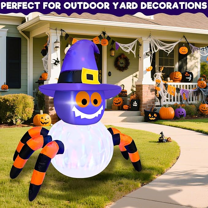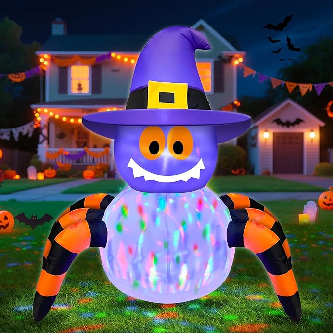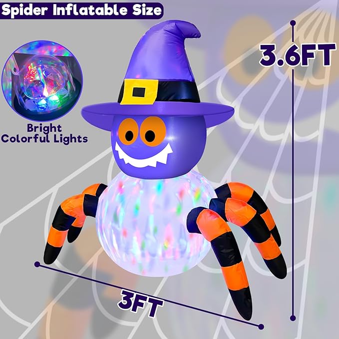 - Halloween Inflatable Decorations: This 3.6 FT eye-catching inflatable spider topped with a witch hat. With rotating colorful lights that cast dynamic hues, it comes with 4 ground stakes, 2 tethers, and 1 sand bag—perfect for indoor/outdoor use in any weather