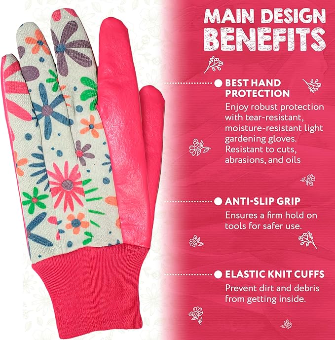 - Women's Garden Gloves Bulk of 6 Pairs. Pink floral garden gloves for women are made in a medium size and have a length of 9 inches, which is ideal for most women's hands. The bright floral pattern looks really feminine and cute, so these planting gloves for thorns protection are sure to cheer you up.