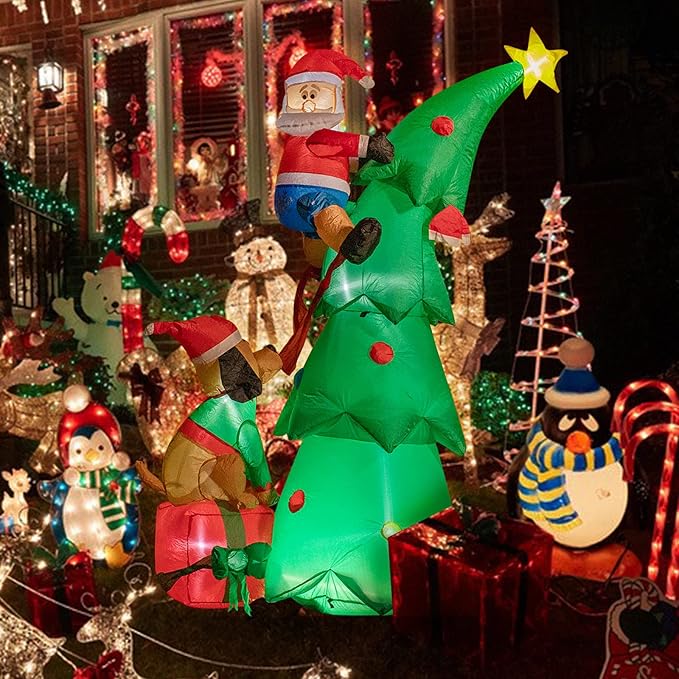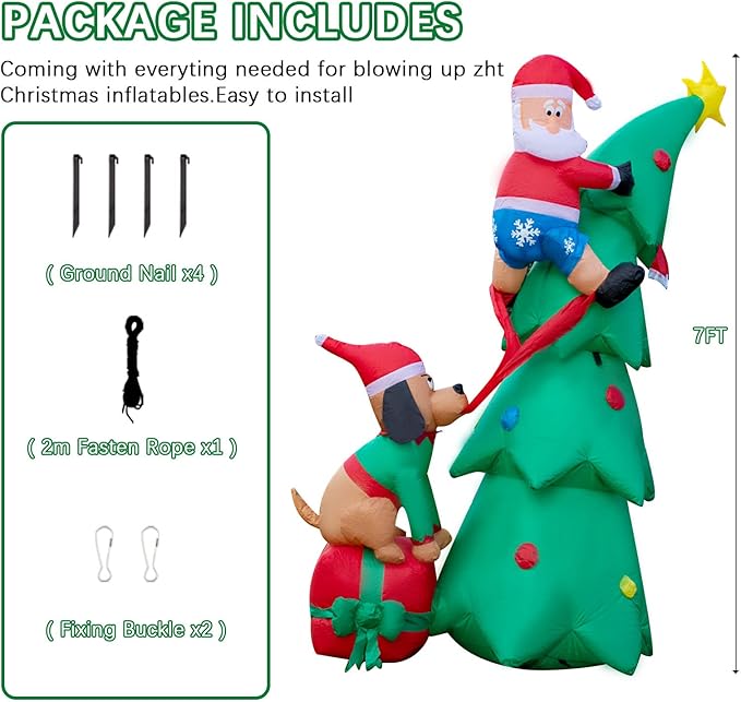 - Exquisite Design - Fun Christmas outdoor inflatable Santa Claus Christmas tree with with dog and gift box with built-in 6 LED lights. The exquisite appearance makes children fall in love at first sight. Make your yard popular around your neighbors. Installed in the yard, enjoy the Christmas holiday with your family, and spread the happy atmosphere to others.