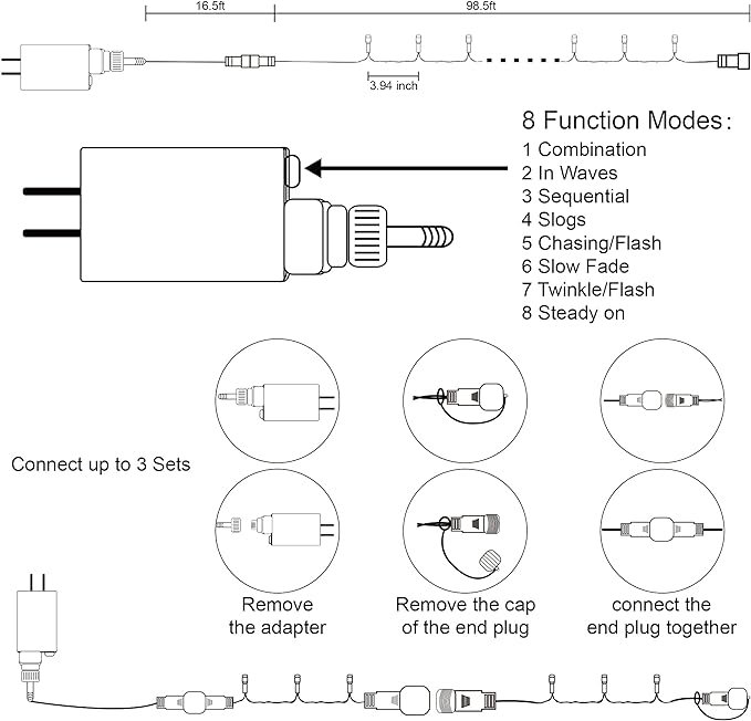- 8 Lighting Modes: This Christmas string light has 8 lighting modes for you to choose - combination, in waves, sequential, slogs, chasing/flash, slow fade, twinkle/flash, and steady on. Just press the button on the transformer to change the lighting mode according to the different requirements.