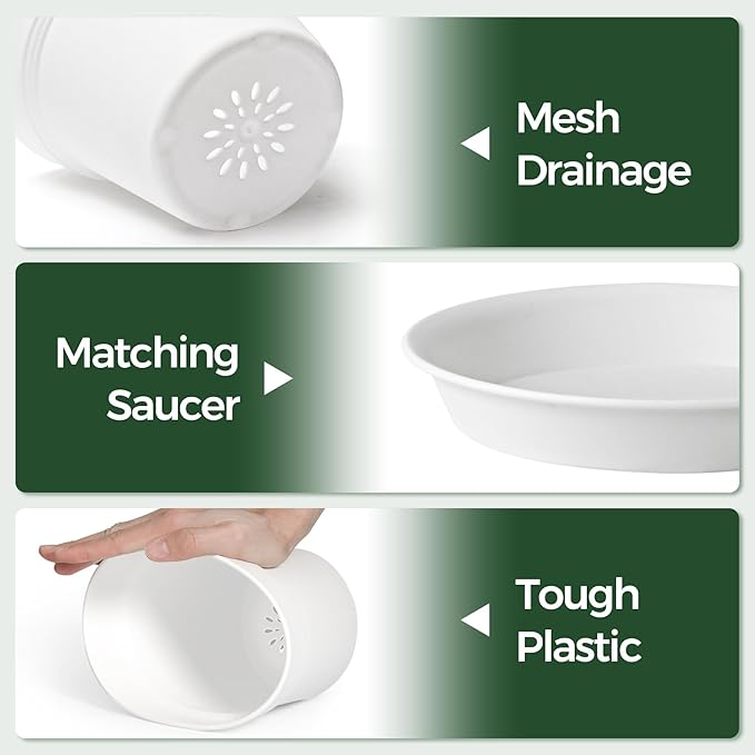 - | Excellent Drainage System | - Multiple mesh drainage holes at the bottom of these 4 inch plant pots make excellent air and water flow, which can protect the health of roots and avoid drowning. Super air permeability and water drainage can prolong the life of your carefully cultivated plants. Also, the saucers can help hold the excess water.