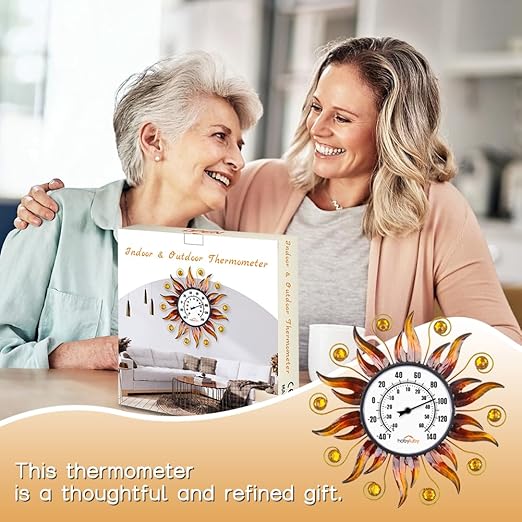 - Exquisite Modeling: A 13-inch sun metal frame and 6.5-inch dial combined with the design of the patio thermometer outdoor can not only measure the temperature but also decorate the room. Giving a present to elders is not only thoughtful of their care but also very decent