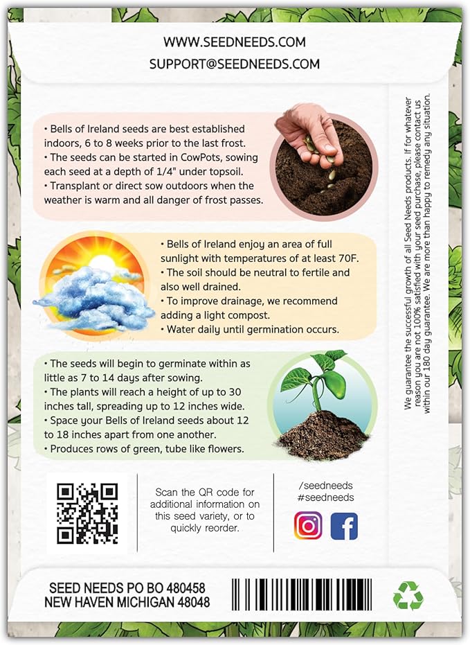 - Freshness - All Bells of Ireland seeds are packaged in tear resistant and moisture resistant packaging. This keeps the seeds a whole lot fresher than the competitions selection!