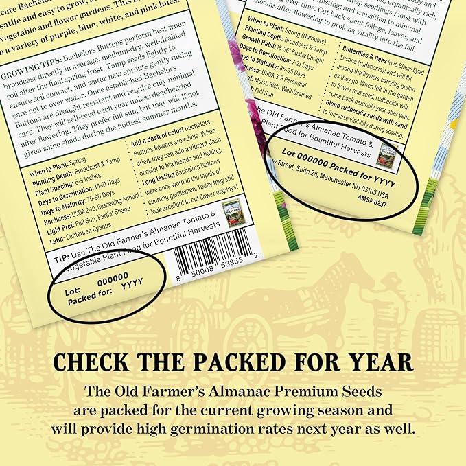 - All seeds from The Old Farmer’s Almanac are packaged in individually styled packets ideal for gifts, storage or immediate use. Each packet displays the flower, vegetable, plant or herb variety on the front with instructions and plant facts on the back.