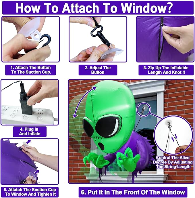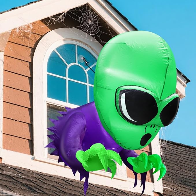 - [ 4 Ft Halloween Inflatable Alien Broke Out from Window ] This 4 Ft Halloween inflatable scary Alien wears purple clothing, Broke Out from window. Come with a Halloween inflatable, 3 screw suckers, 1 fastened tether, and a plug with UL certification.Copyright Certificated Model.