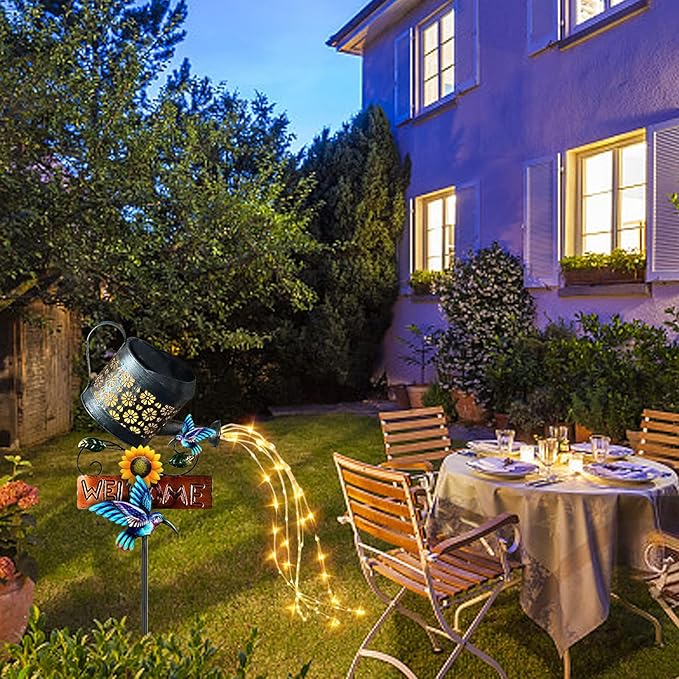 - 【Unique Solar Powered Watering Can Lights】Watering can design is so unique and great decoration for the outdoor. Solar lights outdoor garden decor is not only decorative lights but also our attitude to pursue a quality life. It looks like a shining shooting star pouring down from a watering can. The outdoor solar lanterns absorb energy from the sun directly, you don't have to spend extra electricity bills to get such romantic light.