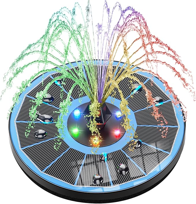 - 6 LED Solar Water Fountain: The solar fountain pump comes with a battery, it's can store electricity under direct sunlight during the day. The stored electricity can make the solar bird bath fountain automatically spray water and light up for up to 3-4h at night. RGB color auto-cycle setting makes your garden look more beautiful at night, it allows you to see the unique light water spray show when you get home from getting off work