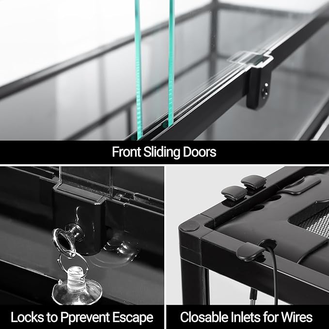 - 【Safety Front Sliding Doors】 Double front opening transparent glass doors for perfect viewing, open easily to feed, clean or add decoration . With double security lock to prevent reptile amphibian pets escape.