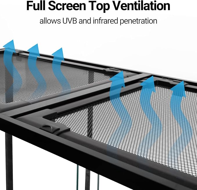 - 【Top Ventilation】The bearded dragon tank top opening and allows full spectrum, UVB, and IR light penetration. Easy installation of lighting and heating on top of mesh screens or within the vivarium.12 holes on the top lid for wire in-out.