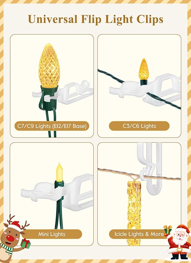 - Longer Service Life: Anti-aging, UV protection, no deforming and weatherproof Christmas lights hanging clips can strongly stay in place in poor weather like heavy rain, snow, sleet and heat, and can be reusable repeatedly or easily removed