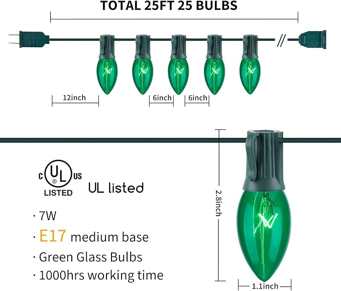 - Christmas string light, 25pc C9 clear green bulbs, 6" lead with male plug, 12" spacing between bulbs, 6" tail with female connector. Lighted Length 24 Feet, total Length 25 Feet