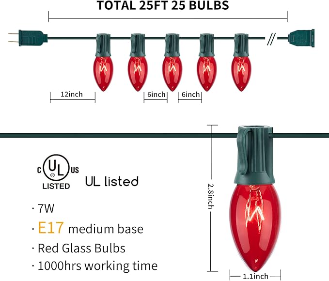 - 【𝐂𝟗 𝐂𝐡𝐫𝐢𝐬𝐭𝐦𝐚𝐬 𝐒𝐭𝐫𝐢𝐧𝐠 𝐋𝐢𝐠𝐡𝐭𝐬】 C9 outdoor Christmas lights come with 25 C9 red color bulbs, a 6-inch lead with a male plug, 12-inch spacing between bulbs, and a 6-inch tail light with a female connector. The outdoor Christmas lights are 24 feet long and 25 feet long overall. It will bring you a warm and cozy Christmas!