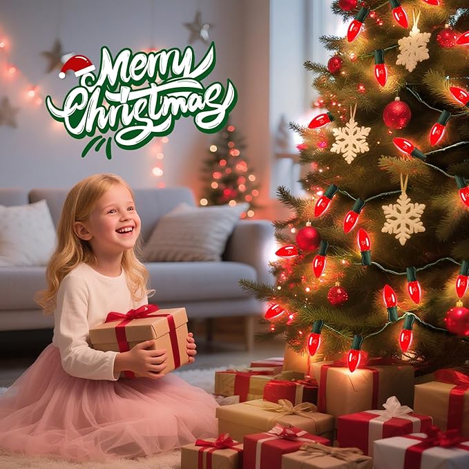 - 【𝐁𝐫𝐢𝐠𝐡𝐭 & 𝐖𝐚𝐫𝐦 𝐋𝐢𝐠𝐡𝐭】 C9 Christmas lights use a candelabra (E17) base. Each classic C9 bulb draws 7 watts, so even if one goes out, it won't affect the entire string. The bright glow of these Christmas lights C9 can illuminate any desired decoration, while their warm, delicate glow exudes a classic Christmas romance, making them a must-have for Christmas!