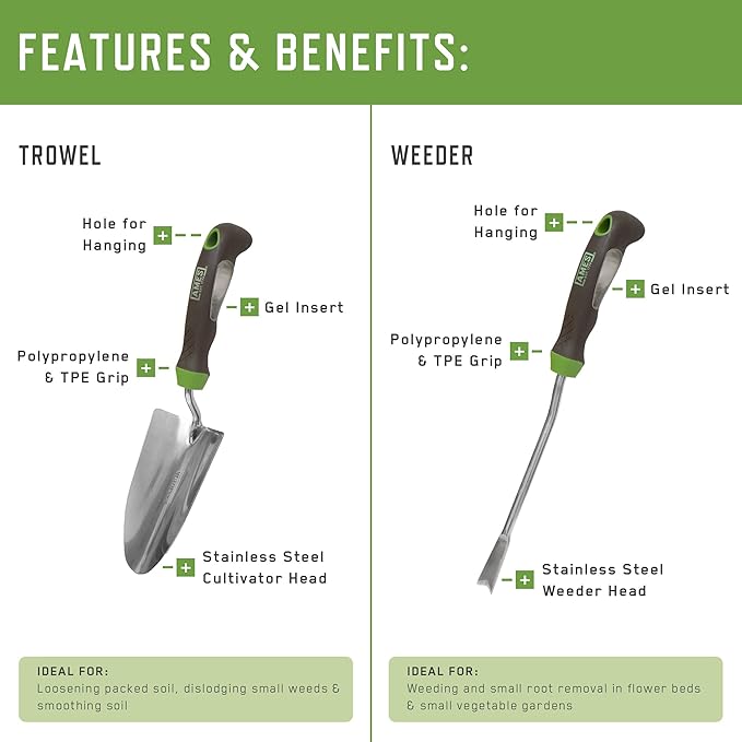 - INCLUDES: Hand Trowel, Hand Weeder, Hand Rake, Hand Transplater, Hand Scoop & Hand Cultivator