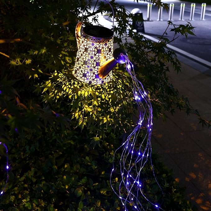 - Suitable for Indoor and Outdoor Use: VOOKRY's solar watering can provides 2 modes of use. You can use the included shepherd's hook to hang it in an outdoor garden and let it water your flowers with flowing stars. You can also put outdoor solar lights directly on its own, which is a good decoration for indoor tables, steps, flower POTS or balconies. (Note: Please put the power switch in the "on" position when charging during the day, and place the solar panel in a well-lit place).