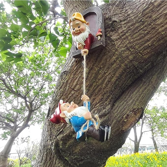 - Garden Gnome Statue: Two cute gnomes are climbing on the tree, making your garden decoration look unique. Cute and vivid statues will add much fun to your garden decor.