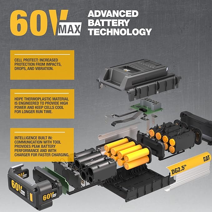 - CORDLESS CHAINSAW WITH BATTERY AND CHARGER INCLUDED: Included Cat 60V battery and charger is compatible with all Cat 60V OPE products. Cat 60V batteries are engineered to resist damage and heat stress to optimize power, runtime, and cell life