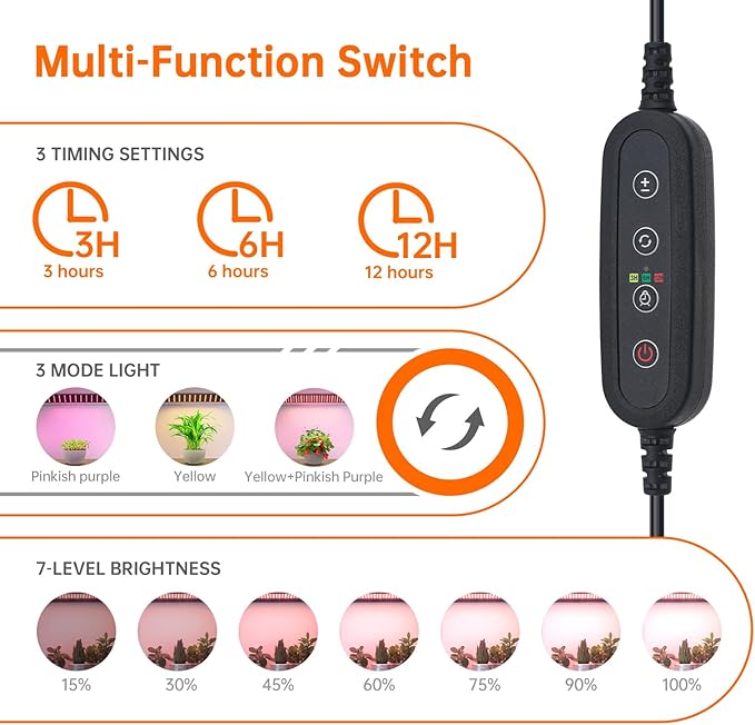 - Multi-function Switch - The switch offers three light modes: yellow, pink, and mixed light, allowing for customizable lighting conditions. It also provides three timing modes: 3/ 6/12 hours, facilitating automated lighting schedules. Additionally, the switch offers seven-level dimming, enabling the brightness to be adjusted from 15% to 100%. This versatile switch ensures the provision of optimal growing light for plants throughout the year
