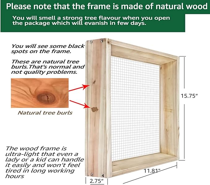 - 3.Sturdy and Ergonomically Designed - The frame is made of solid wood and held together with screws. Both factors make it sturdy. The edges of the frame have been sanded to be rounded off and smooth with a deep trough for pouring in dirt to sift.
