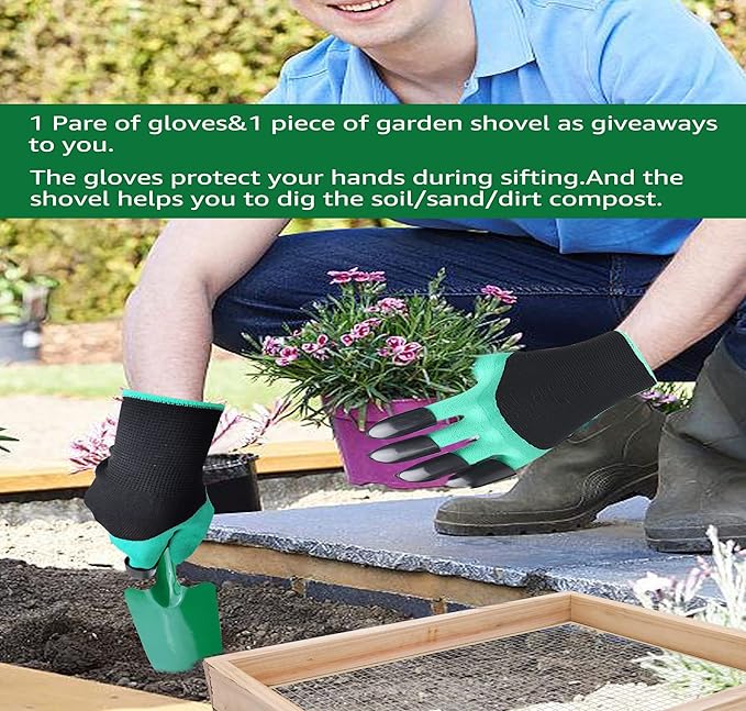 - 5.Free One Pare of Gloves & One Piece of Garden Shovel As giveaways to You: The gloves protect your hands during sifting. And the shovel helps you to dig the soil/sand/dirt compost.These tools will make you easy working. They are free!!! Hope this soil sifter makes your life better!(Please keep away from water for it’s made of natural wood)