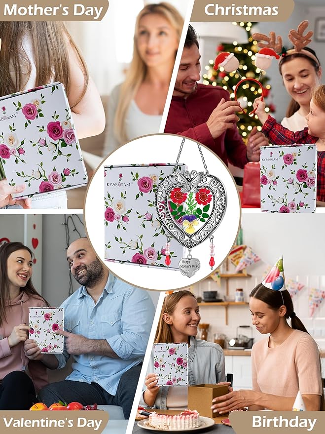 KY&BOSAM Suncatcher Happy Mother’s Day Stained Glass Tree of Life Heart Gifts Garden Ornament Wind Chimes for Windows Pressed Flower Between Heart in Glass Metal Engraved Charm as