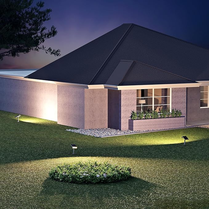 - ✅【Smart Light-controlled Solar Spotlight】Charges with solar energy during the day and automatically lighting up at night. With its unique product design and monocrystalline silicon solar panels, the photoelectric conversion rate of solar panels is up to 20%, improving the charging time and overall lifetime of the product.