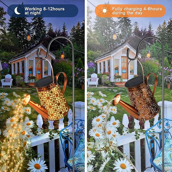 - 【Multiple Occasions Use】Use the lengthen shepherd hook (40in) place the solar watering can light in the garden, backyard, pathways, etc. You can also use the hooks to hang directly from the tree.