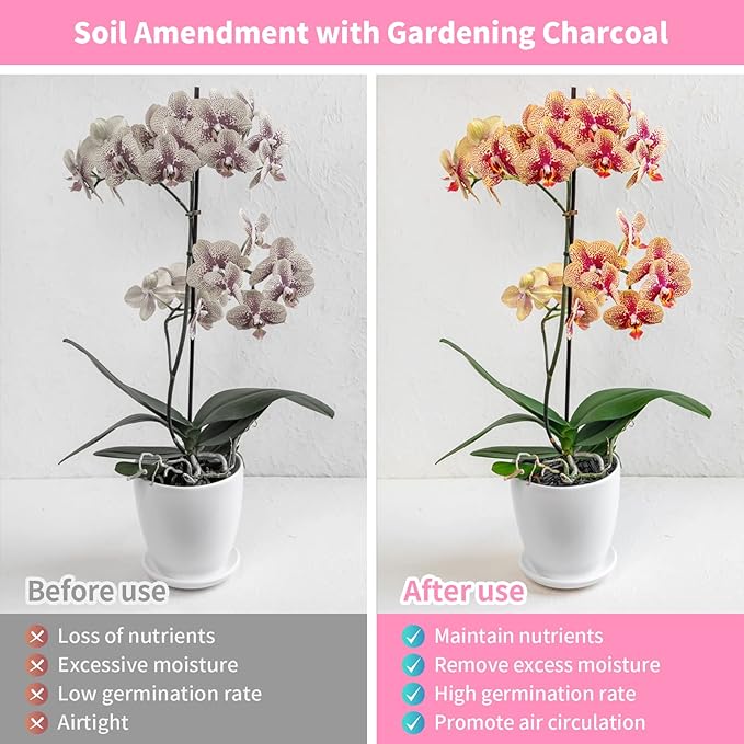 - Charcoal Orchid Soil Amendment: Our horticulture charcoal is 100% natural hardwood horticulture charcoal, which is a lightweight and mild soil additive that will assist in draining excess moisture from any container or potted plant; They are great for adding to any plant soil for drainage such as bonsai soil, orchid soil, and succulent soil
