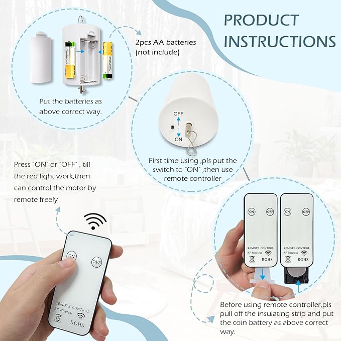- 【Easy to use】First time using ,pls put the switch to "ON",then use remote controller.Remote Controller can conveniently turns on and switch off the motor,gives a simple and easy way to get your hanging decor moving or stopping,while anywhere your hanging decor hang you desire.