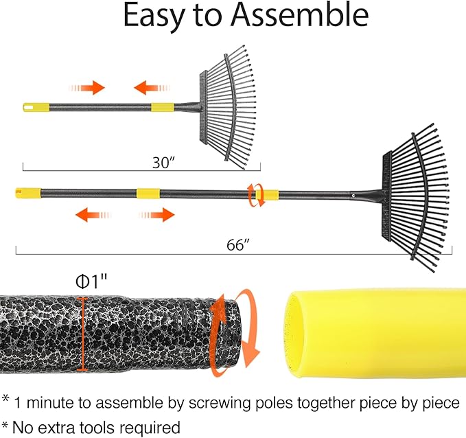 Collapsible Rake for Leaves, 30-66 inch Metal Leaf Rakes for Lawns Heavy Duty Extended Handle, 25 Tines 18" Wide Rake Garden Tools for Camping, Yard, Landscape, Pine Needle and Grass