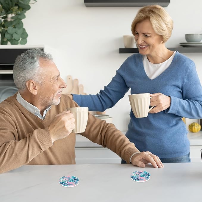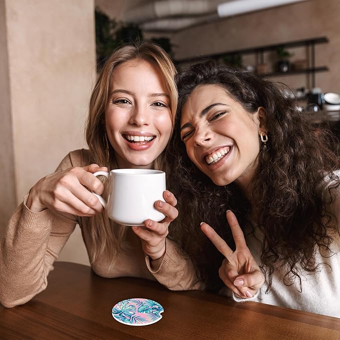 Tropical Pink Palm Leaves Car Coasters,Ceramic Absorbent Cup Holders with Finger Notch & Cork Base Car Assecories for Women/Men 2.6"(2 Pieces)